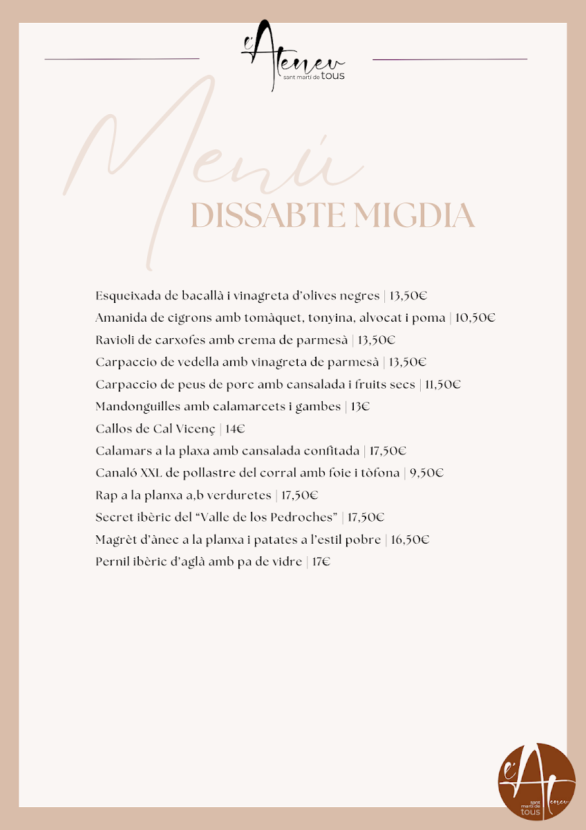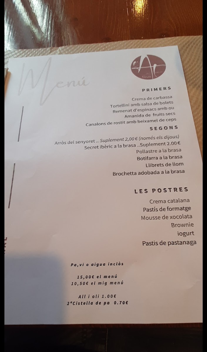 The menu at Ateneu De Tous reflects a clear commitment to traditional Catalan flavors, focusing on hearty, well-executed dishes rather than an overextended selection. Plates like Mandonguilles En Samfaina stand out for their comforting, home-style character, combining tender meatballs with a rich vegetable-based sauce that feels deeply rooted in local cooking traditions. Secret Ibèric highlights the restaurant’s strength in handling premium cuts of meat, delivering a dish that is both robust and balanced, appealing to diners who value simplicity done right. For those drawn to classic, slow-cooked recipes, Callos Caseros represents a faithful take on a time-honored dish, offering depth of flavor and a satisfying, rustic texture. The combination dish Butifarra Panxeta Ou Ferrat Llom Rosses I Seques showcases abundance and variety on a single plate, blending sausage, pork belly, fried egg, loin, potatoes, and dried beans into a filling option that captures the essence of traditional rural cuisine. Seafood is not overlooked, with Rap Planxa Amb Patates providing a lighter yet equally authentic alternative, where grilled monkfish is paired with potatoes to emphasize freshness and straightforward seasoning. Taken together, the menu forms a cohesive culinary narrative that prioritizes authenticity, generous portions, and familiar flavors, making it clear that Ateneu De Tous is a place where the menu serves as a reflection of local identity and honest cooking rather than culinary trends.